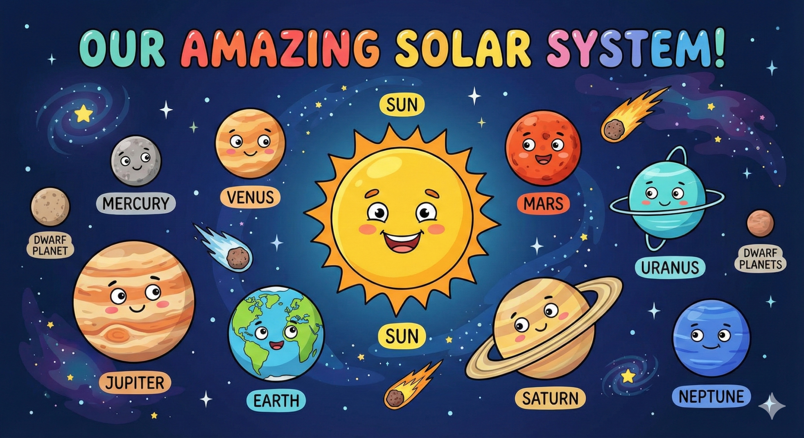 The Solar System is our cosmic home — a huge space dominated by the Sun and everything that moves around it. It includes planets, dwarf planets, moons, asteroids, comets, dust, gases, and millions of tiny objects that orbit due to the Sun’s strong gravitational pull.